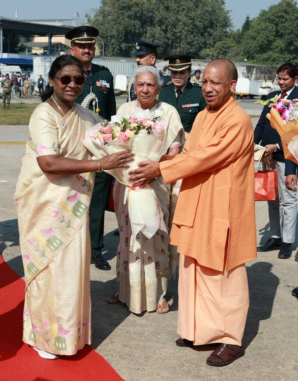 मा० मुख्यमंत्री योगी आदित्यनाथ जी 28 नवंबर, 2025 को अमौसी एयरपोर्ट लखनऊ पर मा० राष्ट्रपति श्रीमती द्रौपदी मुर्मू जी का स्वागत करते हुए।